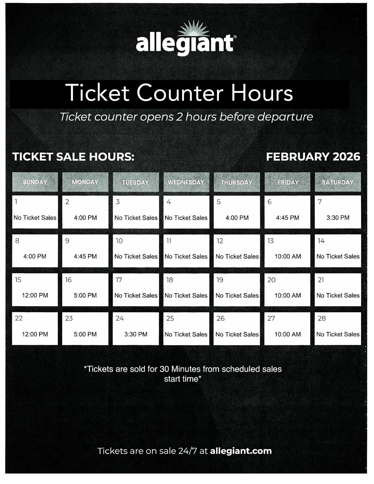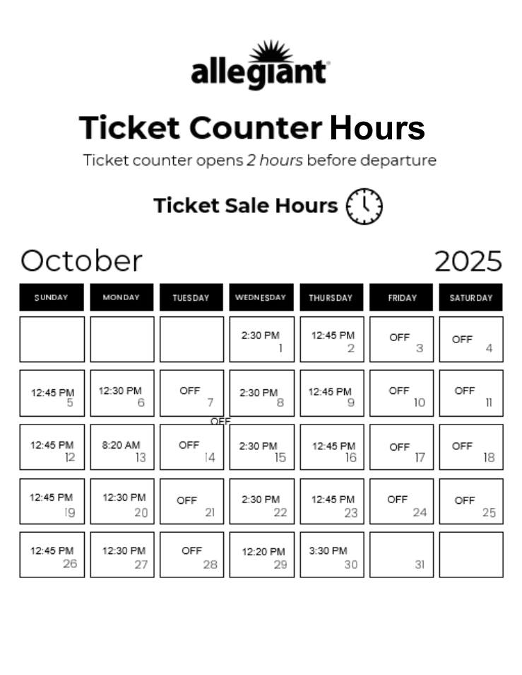 To purchase tickets in person, please note Allegiant’s Service Counter hours are limited. Staff is generally available at the service counter window two hours before flight departures. Check Allegiant’s counter